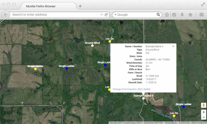 Enables you to place hunters in a general direction to save time and vehicle fuel. Allows you send the stand location to the guide's or hunter's cell phone. This is beneficial when you have a new stand or new guides. Extremely beneficial when operating a day lease program by sending stand or map to a hunters cell phone.